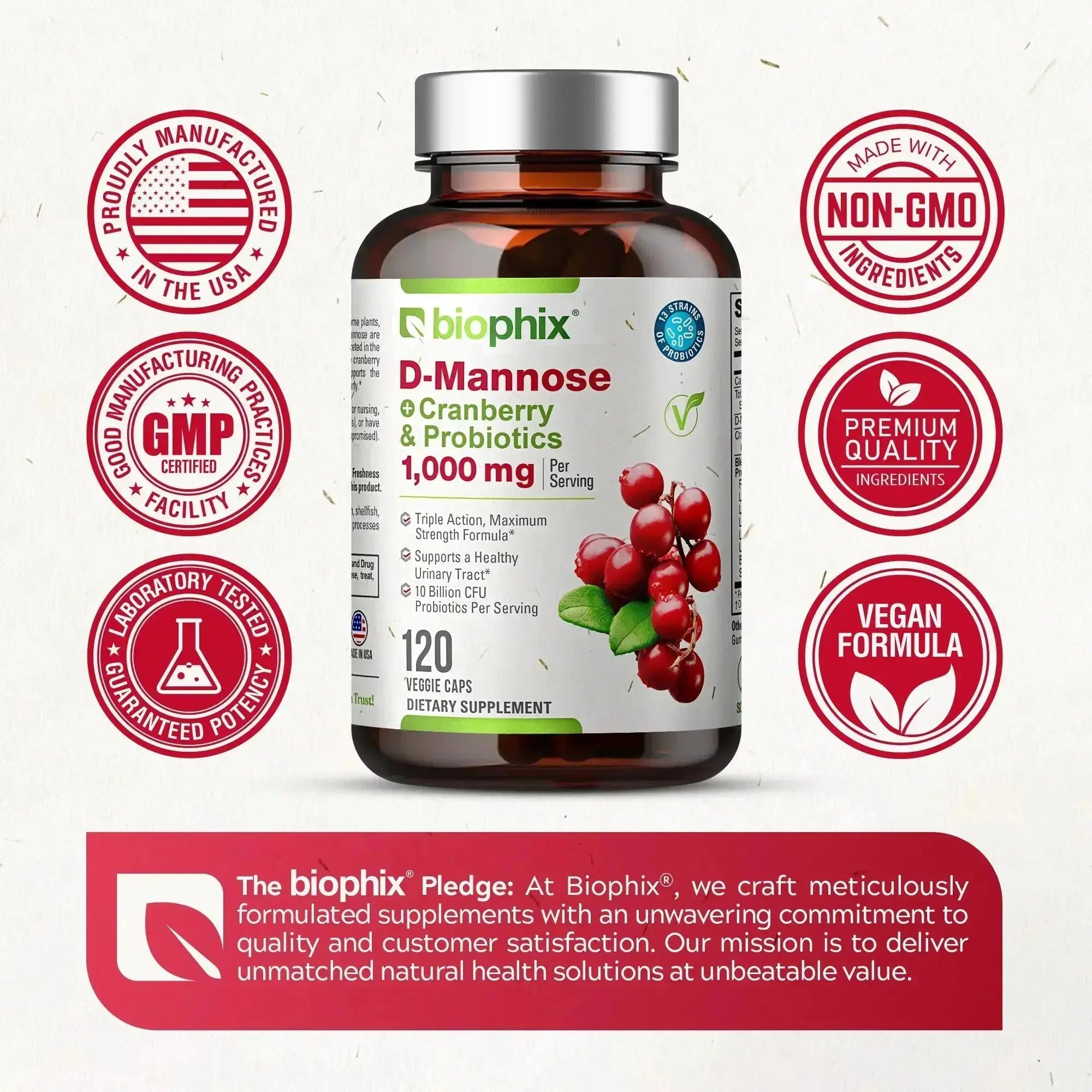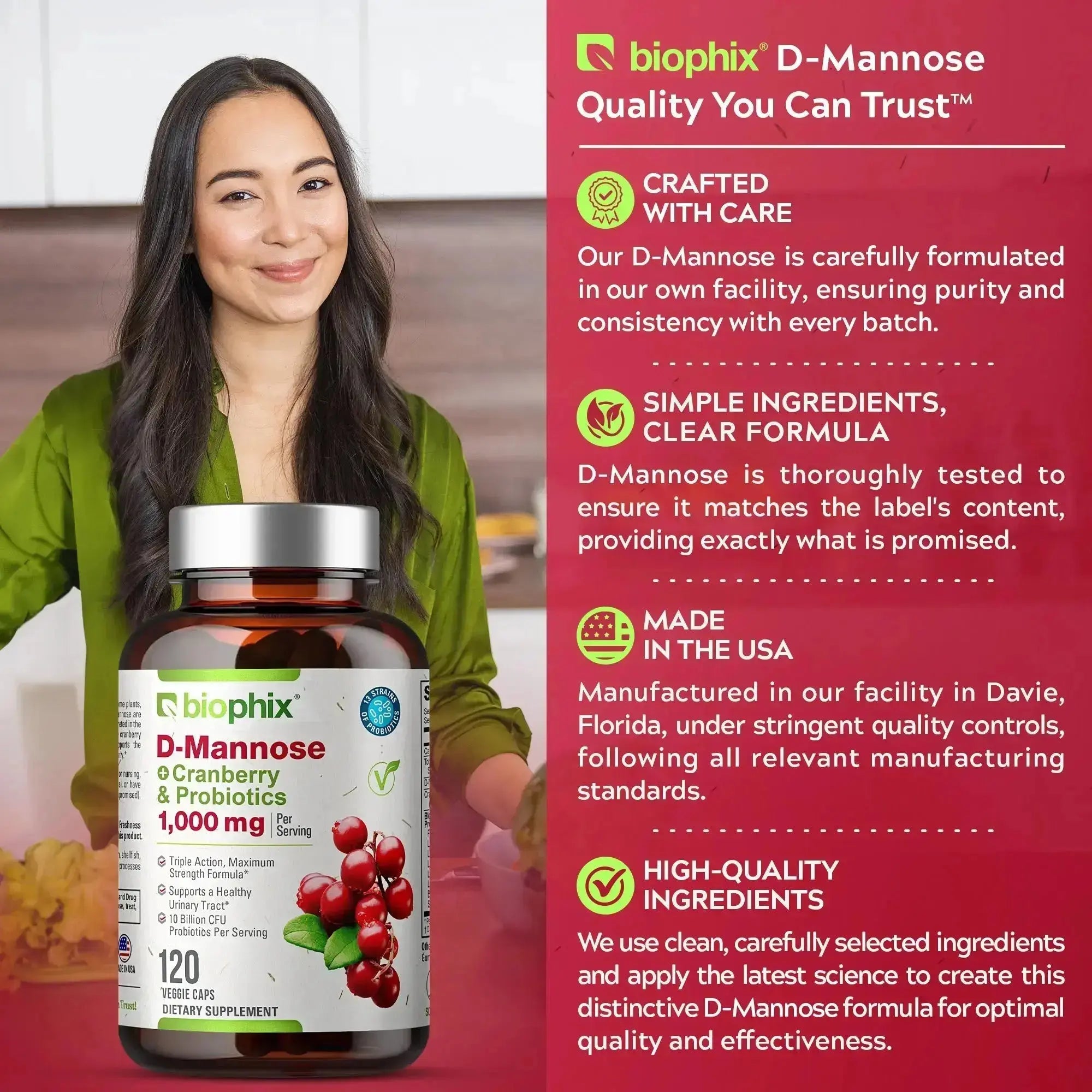 BIOPHIX QUALITY YOU CAN TRUST: Manufactured in the USA under strict GMP standards, our d-mannose with cranberry supplement is third-party tested to ensure safety, quality, and effectiveness