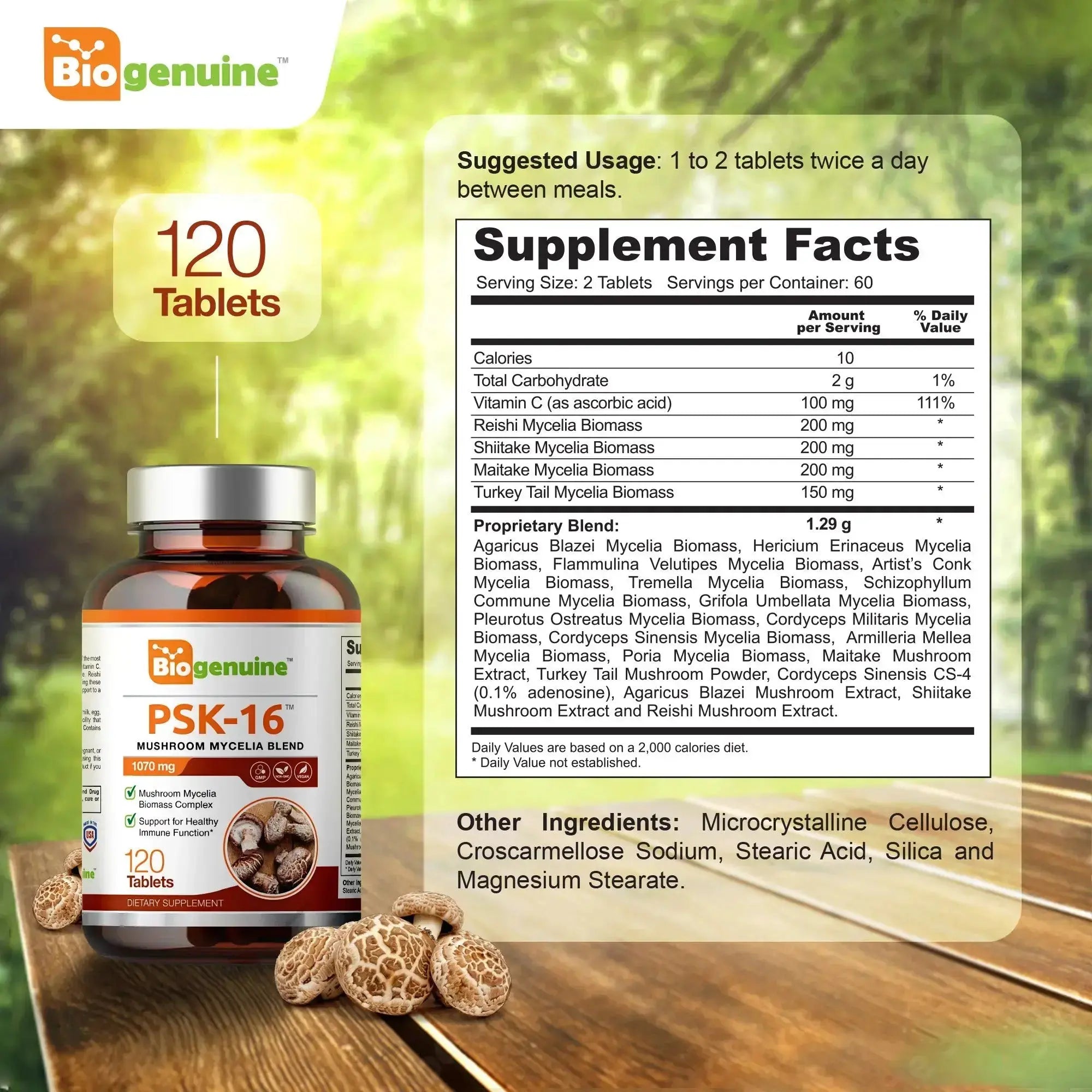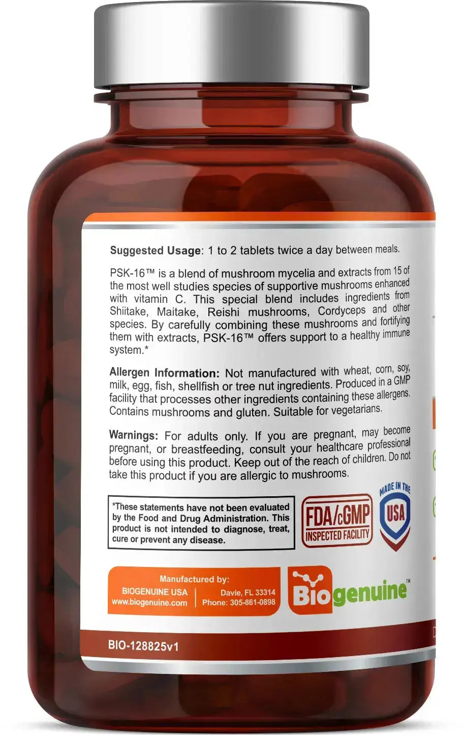 Introducing Biogenuine® PSK-16™ Natural Mushroom Blend; a powerful immune support supplement that contains Vitamin C and mycelia and extracts from 15 carefully selected medicinal mushrooms. Our blend is made with the finest ingredients and is designed to help support normal immune system health.*