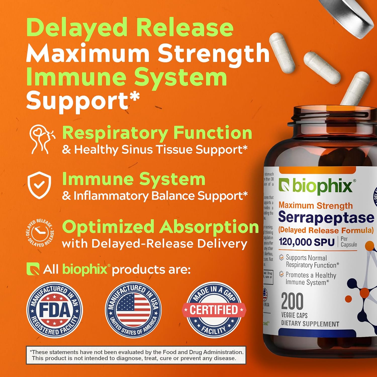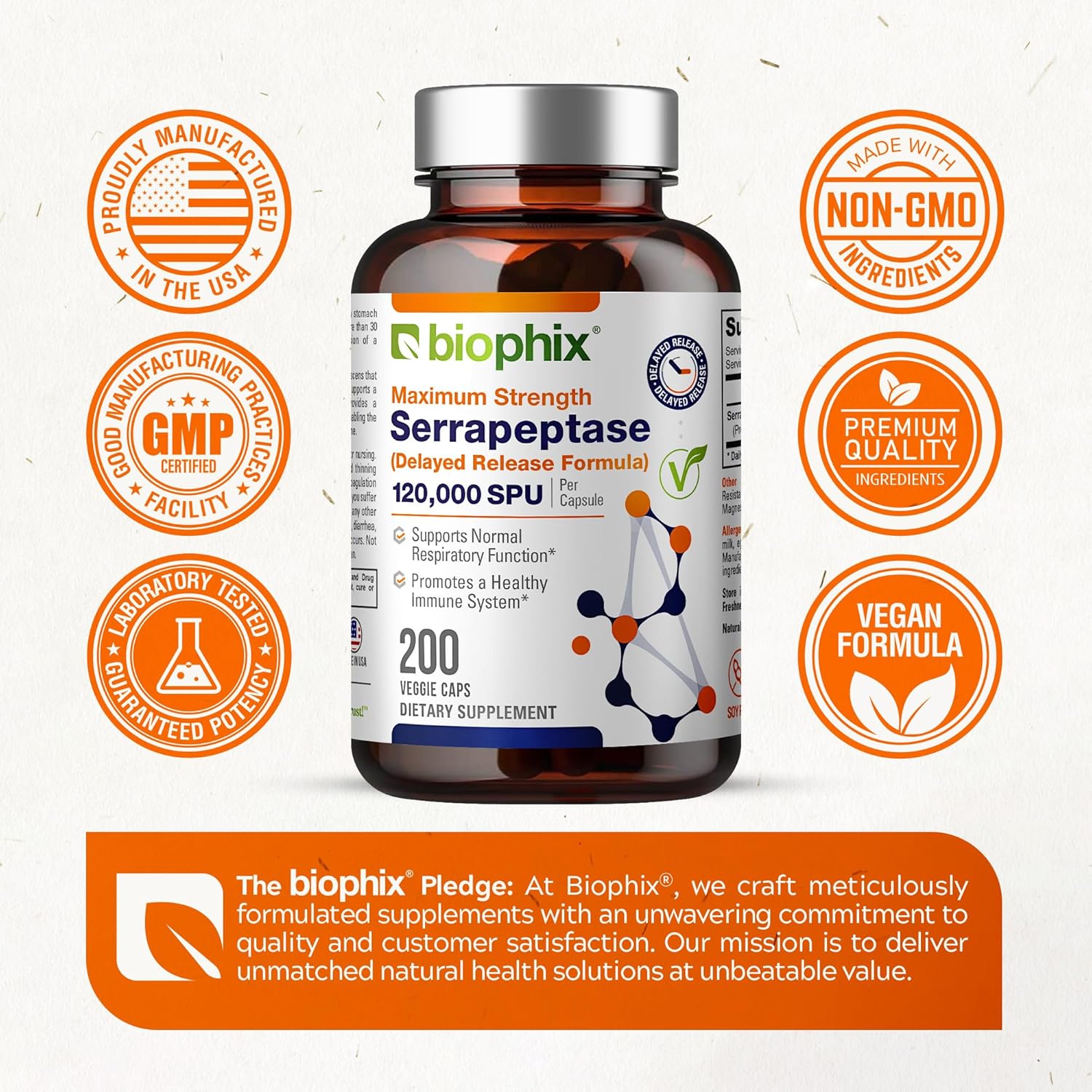 Introducing Biophix Serrapeptase! Derived from the friendly bacterium Serratia marcescens, Serrapeptase (serratiopeptidase) is commonly known as a potent protein-digesting enzyme. This third party tested, delayed-release formula, delivers a full dose of 120,000 PSU (Serrapeptase Units) per capsule. Delayed-release capsules ensure maximum efficacy by surviving the stomach acid and reaching the small intestine, where the enzymes perform best. We pride ourselves on using only the finest Serrapeptase powder, free from unnecessary additives, GMO’s and pesticides, ensuring a clean and wholesome product. Manufactured with care in the USA in our own cGMP certified facility, our product is backed by over 25 years of experience and cGMP certification, guaranteeing strict quality control measures. Rigorous third-party lab testing ensures purity, potency, and safety, giving you peace of mind with every serving. Soy-free, dairy-free, and suitable for vegans, our formula caters to various dietary preferences and restrictions. Because we believe that everyone deserves access to quality health products, we stand by our commitment to excellence. Trust Biophix Serrapeptase for premium quality and unparalleled support for your health journey!