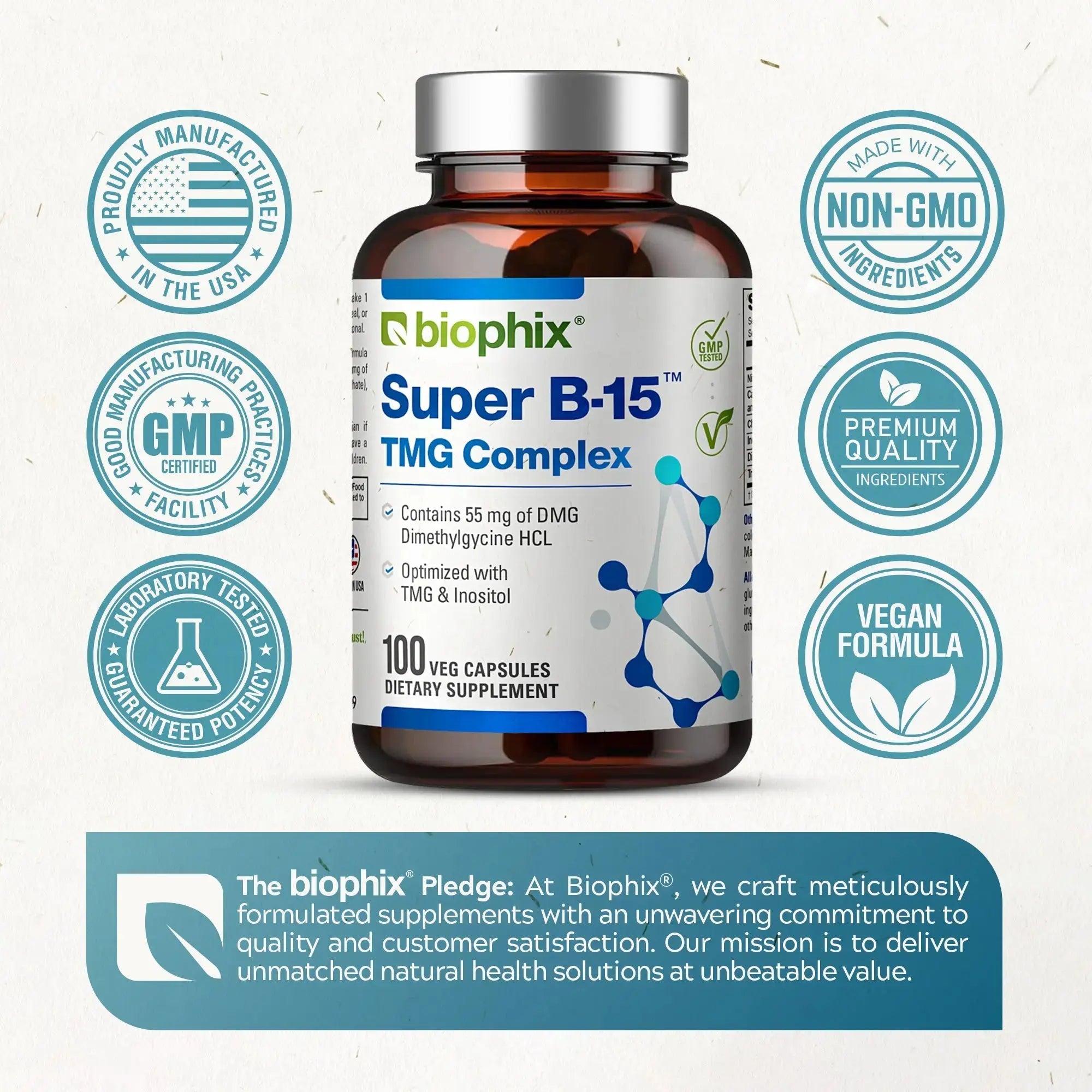 Super B15 TMG is a safe, non toxic water soluble nutrient that may help boost physical energy and stamina by supporting your body oxygen management. Super B-15 TMG is a complex formula consisting of 55 mg N, N-Dimethyl Glycine (DMG), 54 mg of Calcium (as Gluconate & Tri-calcium phosphate), and other supportive factors.
