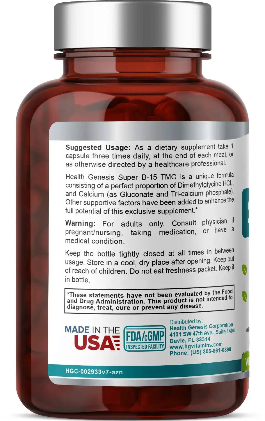 Super B15 TMG is a safe, non toxic water soluble nutrient that may help boost physical energy and stamina by supporting your body oxygen management. Super B-15 TMG is a complex formula consisting of 55 mg N, N-Dimethyl Glycine (DMG), 54 mg of Calcium (as Gluconate & Tri-calcium phosphate), and other supportive factors.