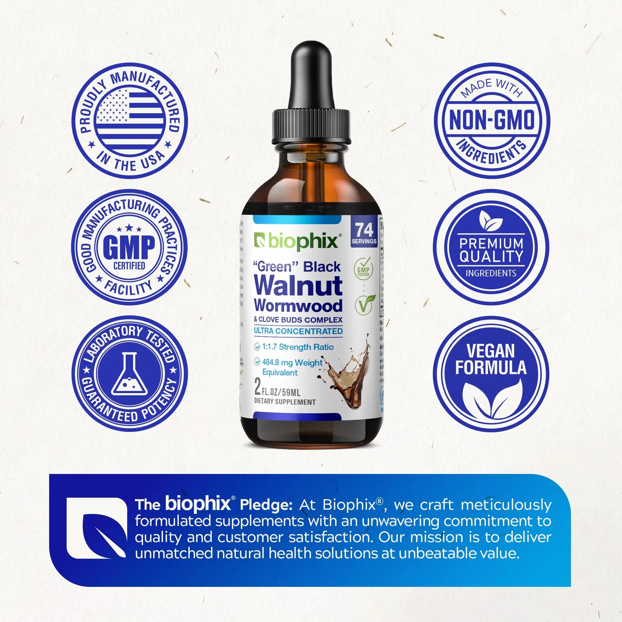 Biophix Fresh Green Black Walnut Complex combines three herbal extracts: fresh (green) black walnut hulls (Juglans nigra) wormwood (Artemisia absinthium) and clove buds (Syzgium aromaticum) in one convenient liquid supplement.